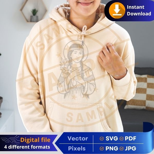 Embrace the spiritual power of the Kateri Tekakwitha with this high-quality digital design. This religious symbol is perfect for Cricut projects, sublimation printing, laser engraving, vinyl cutting, DTF, and more! Whether you’re crafting Catholic gifts, church decorations, apparel, or home décor, this versatile file is ready for your next project.