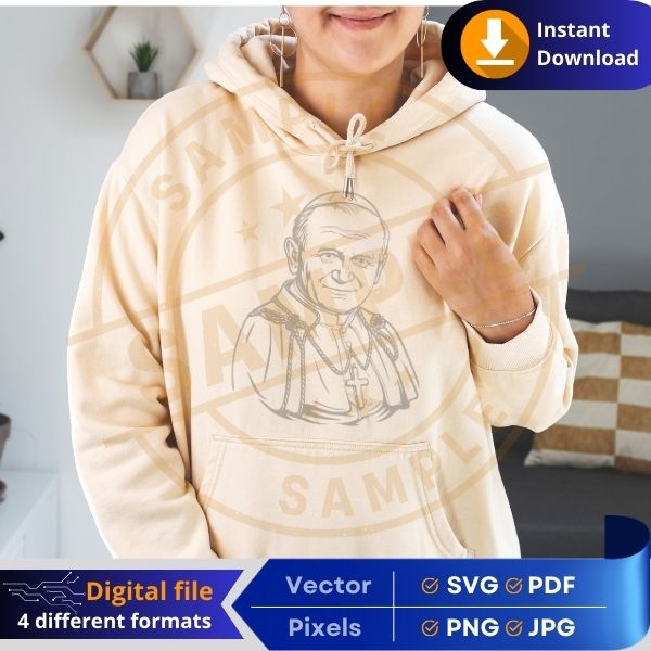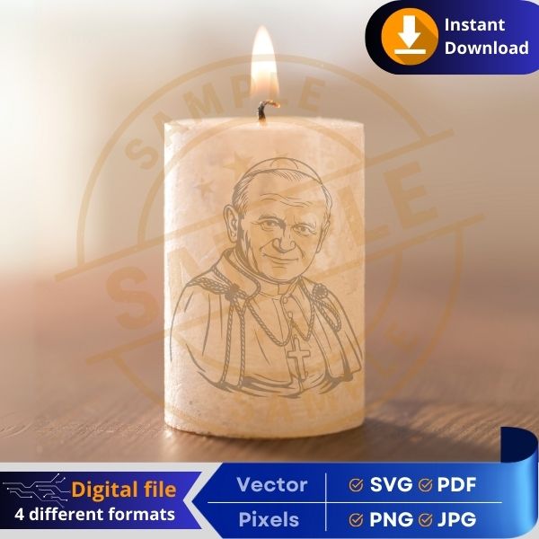 Embrace the spiritual power of Pope John Paul II with this high-quality digital design. This religious symbol is perfect for Cricut projects, sublimation printing, laser engraving, vinyl cutting, DTF, and more! Whether you’re crafting Catholic gifts, church decorations, apparel, or home décor, this versatile file is ready for your next project.